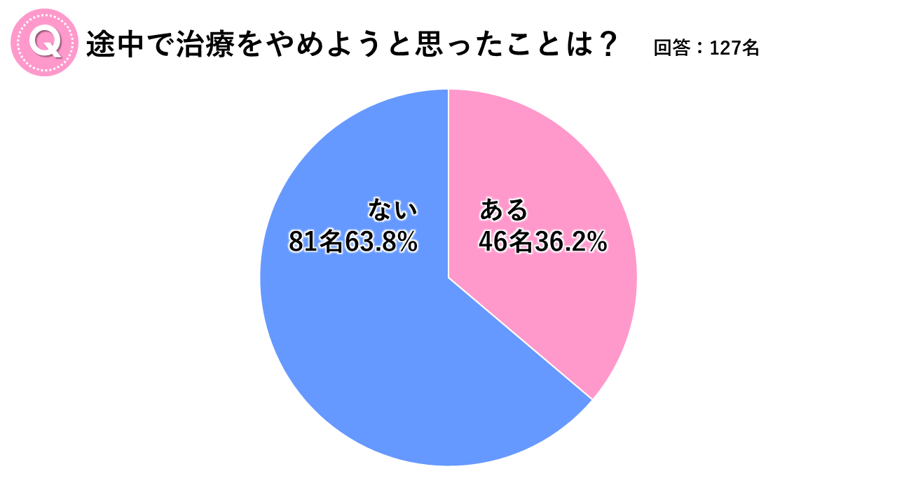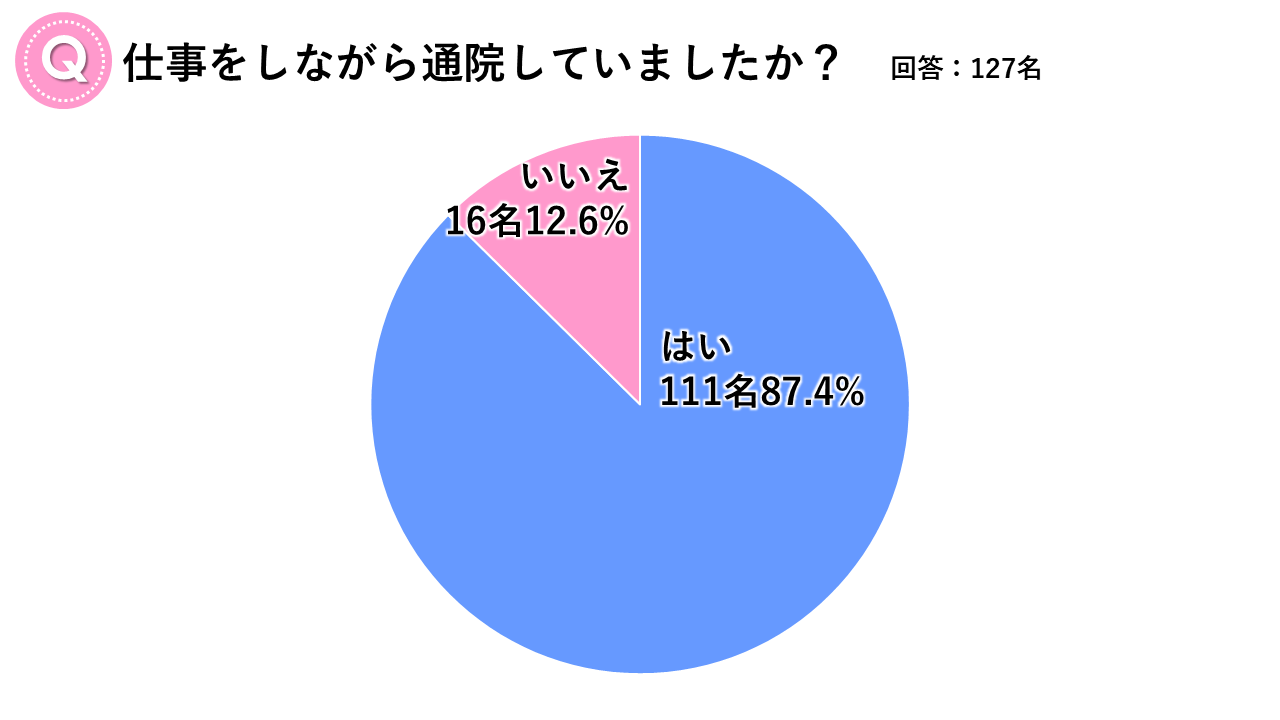 | やはり治療が進むにつれて通院回数が多くなったことがきつかったです。かなり融通が効く仕事、かつ職場の理解があったので通い続けられました。 |