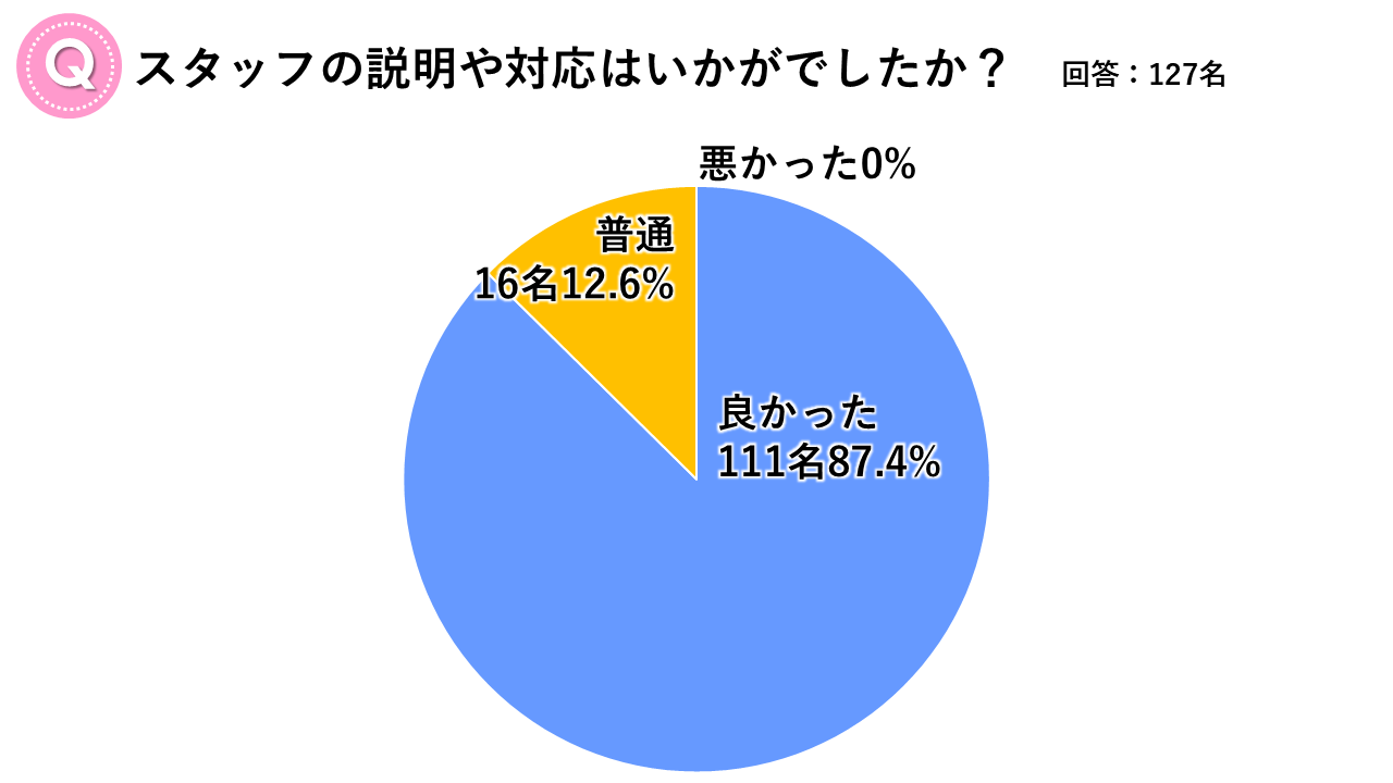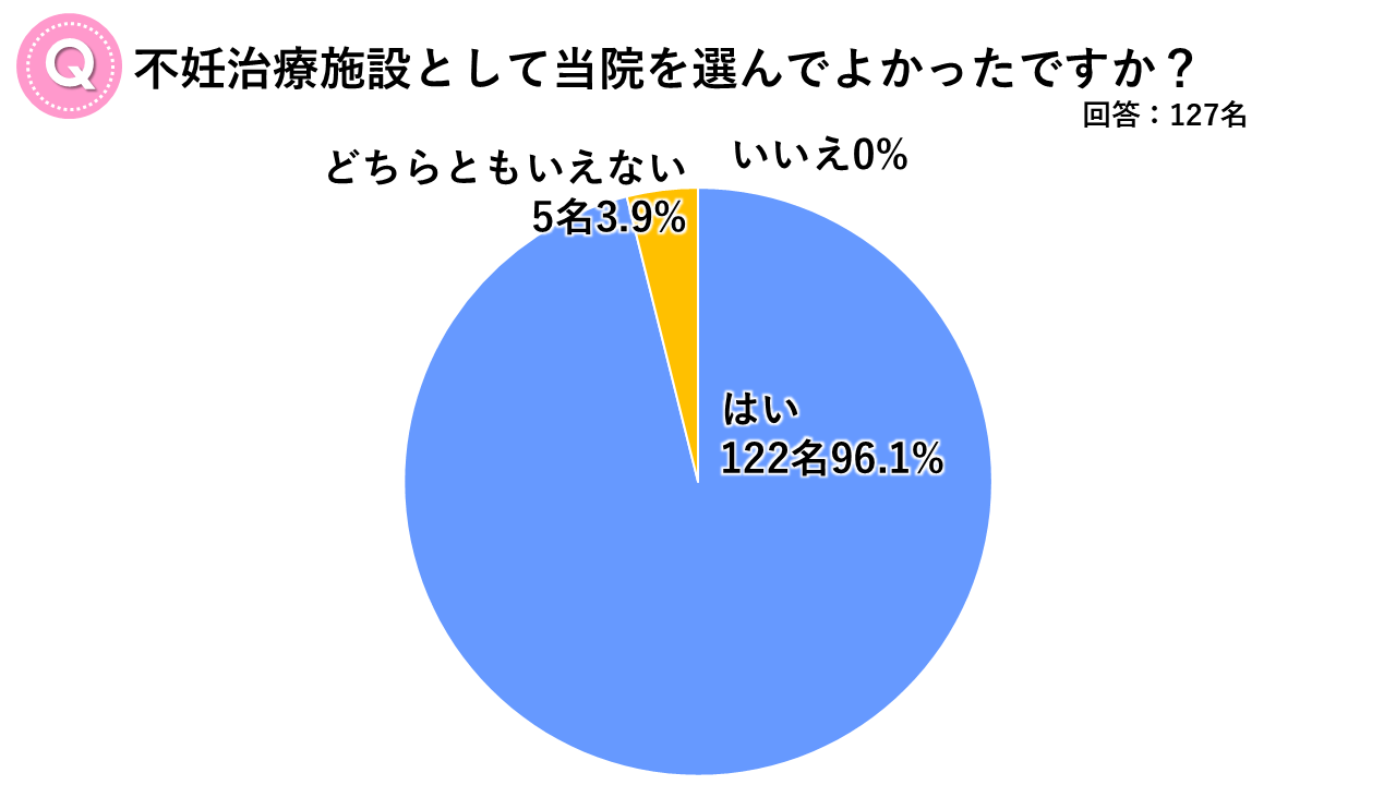 | 治療自体はきつかったですが、最終的に妊娠できたからです。また、施設が綺麗で職員間の連携がきめ細やかに取られていると感じる場面が多く、安心して通うことができました。入院中のご飯が美味しかったのも嬉しかったです。 |